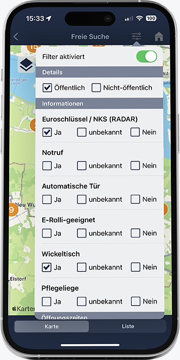 Passe die Suche individuell an Deine Anforderungen an – etwa nach E-Rollstuhl-Tauglichkeit, Euroschlüssel oder aktuellen Öffnungszeiten. So findest Du unterwegs genau die barrierefreie Toilette, die wirklich zu Dir passt.